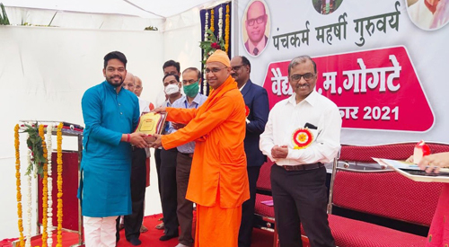 Dr. Niteen Ambatkar , alumni of MGACH& RC ( Batch 2012-13) got felicitated with a Prestigious Award in the field of Ayurveda of Maharashtra state. " GURUVARYA T.M. GOGATE SMRUTI PURASKAR - 2021 " at Samaka Ayurveda , Yavatmal on 14-2-2021,by the auspicious hands of dignitaries in the field of Ayurveda & Spirituality as well, for his constant dedicated work for uplifting Ayurveda as new generation vaidya and for his continued efforts in social activities in spite of difficult time in pandemic.