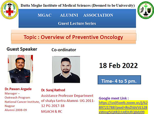 Mahatma Gandhi Ayurved College, Hospital and ResearchCentre, Salod(H) in association with Alumni Cell DMIMShad organized an online webinar on "Overview of preventive oncology "for all the Alumni of MGACH& RC on 18.02.2022. Webinar was conducted by Dr. Suraj P Rathod ,Assistant Professor Department of Shalyatantra MGACH& RC. Our Guest Speaker was Dr. PawanArgade ,Alumni of2008 Batch and now working as a Manager -Outreach Program National cancer Institute, Nagpur . In his lecture he addressed us about various cancerous situations ,its causes ,pathophysiology ,awareness about cancer which is must in today’s era and much more.The session benefitted 116 UG students.