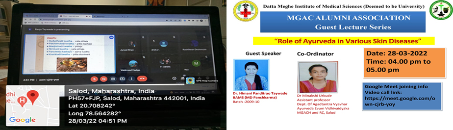 Mahatma Gandhi Ayurved College, Hospital and ResearchCentre, Salod(H) in association with Alumni Cell DMIMShad organized an online webinar on "Role of Ayurveda in Various Skin Diseases"for all the Alumni of MGACH& RC on 28.03.2022. Webinar was conducted by Dr.MinakshiUrkude,Assistant Professor Department of AgadtantraVyavharAyurvedEvumvidhivaidyaka, MGACH& RC, Salod. Our Guest Speaker was Dr.HimaniTaywade,Alumni of 2009 Batch and now she is well known practitioner in Panchkarma. In his lecture he addressed us about various skin diseases, its causes, pathophysiology, Ayurvedic treatment and prevention which is beneficial in today’s era.The session benefitted to 166 UG students.