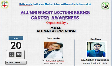 Mahatma Gandhi Ayurved College, Hospital and Research Centre, Salod(H) in association with Alumni Cell DMIMS had organized an online webinar on "cancer awareness” for all the Alumni of MGACH & RC on 20.05.2022. Webinar was conducted by Dr. Akshay S. Pargaonkar Alumni & Assistant Professor Department of Dravyaguna MGACH & RC. Total 55 Alumni were attended the session. Guest Speaker was Dr. Sumaiya Ansari Alumni of Under Graduation 2013-14 Batch serving as RMO at National Cancer Institute, Nagpur. In her lecture she explained about Cancer, its causes, symptoms, types, and principles of treatment and strength of Ayurveda in the management of various cancers, Lifestyle modification according to Ayurveda. Then the session was end on vote of thanks given by Dr. Akshay S. Pargaonkar.